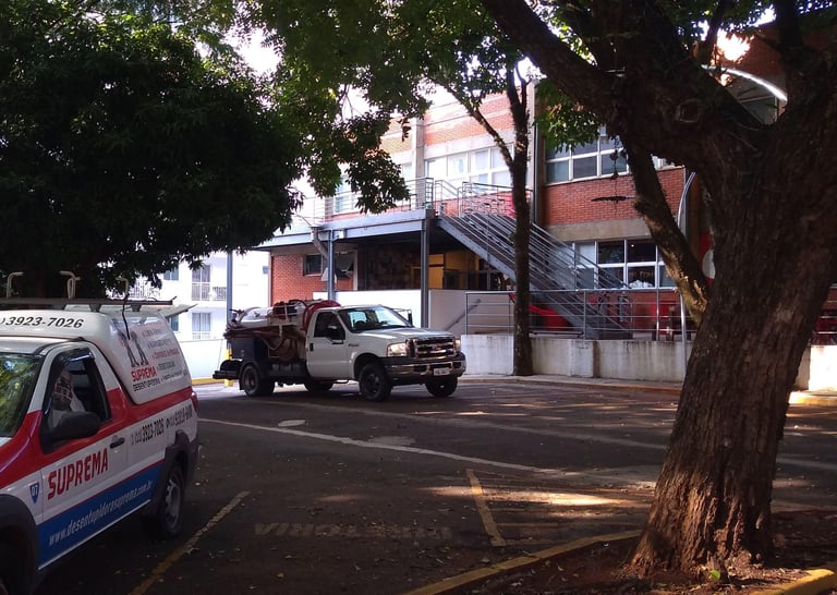 Desentupimento de rede de esgoto, com maquinário profissional, técnicas de hidrojateamento e sucção.